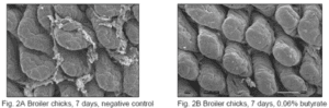 Another benefit of using Butyrate in piglet feeds is an increase in lactic acid and lactobacillus bacteria in the gut (Galfi et al., 1991). These increases were accompanied by reductions in harmful bacteria such as E. Coli. The increase in lactic-acid-producing bacteria in the gut may lead to improved gut health due to reduced gut pH, which limits disease-causing bacteria since they typically prefer an environment with a more neutral pH.Improving the health of the intestinal cells is one of the keys to helping young pigs both use feed efficiently and to combat intestinal challenges such as E. coli and PEDv after weaning. The following photos from Malheiros and Ferket (2010) show the difference in intestinal cell health of broilers fed Butyrate. It is obvious that the cells from the Butyrate-fed broilers are more robust and healthier than the cells of the birds not fed the Butyrate. This also occurs in the intestine of the piglet; the more robust cells also make a tighter, less-pervious barrier between the gut and the body. A tighter barrier leads to fewer bacteria absorbed into the body, which further improves the health of the pig.