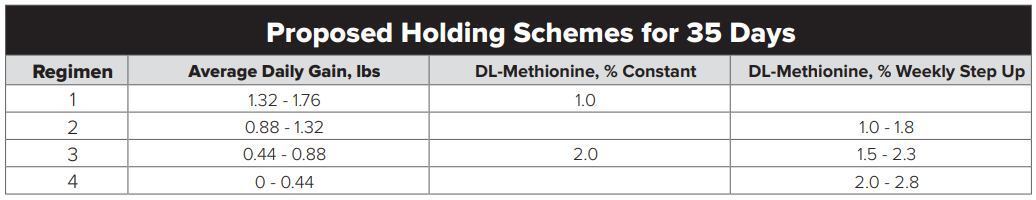 Regimen 2 – To achieve a daily gain of about 1 lb/day, add Methionine at 1% of the diet during week 1. Then add 1.2% Methionine during week 2; 1.4% Methionine during week 3, 1.6% Methionine during week 4 and 1.8% Methionine during week 5.