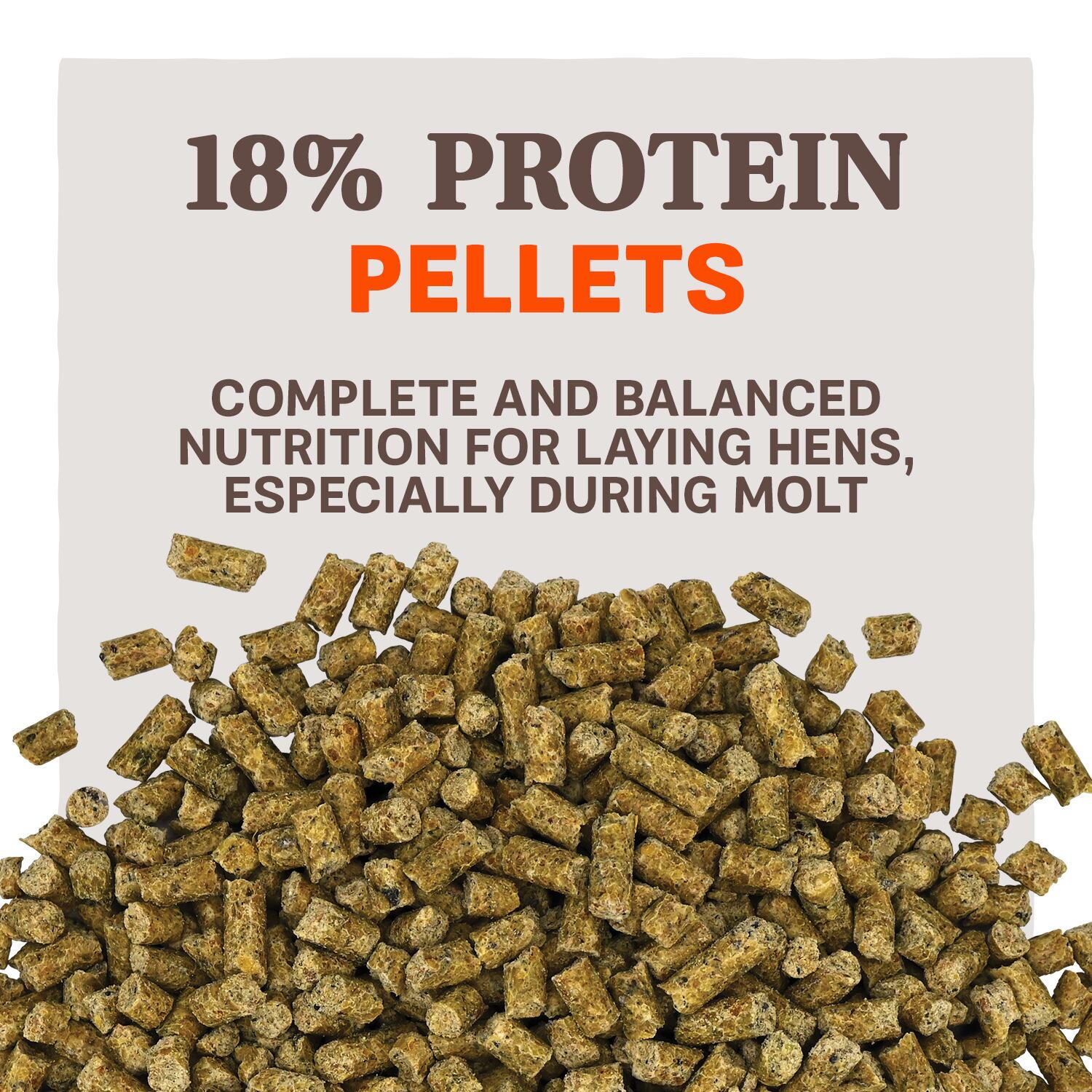 - 18% Protein - A higher level of protein supports the increased requirements of birds during molt and birds allowed to free range.