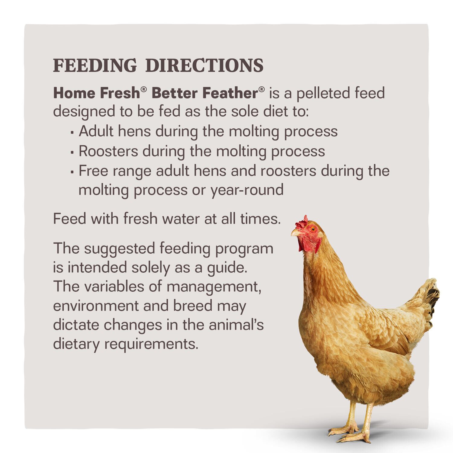 - Adult hens during the molting process. After molt, transition to Home Fresh Extra Egg Layer or remain on Home Fresh Better Feather throughout the laying cycle if additional protein is desired.
