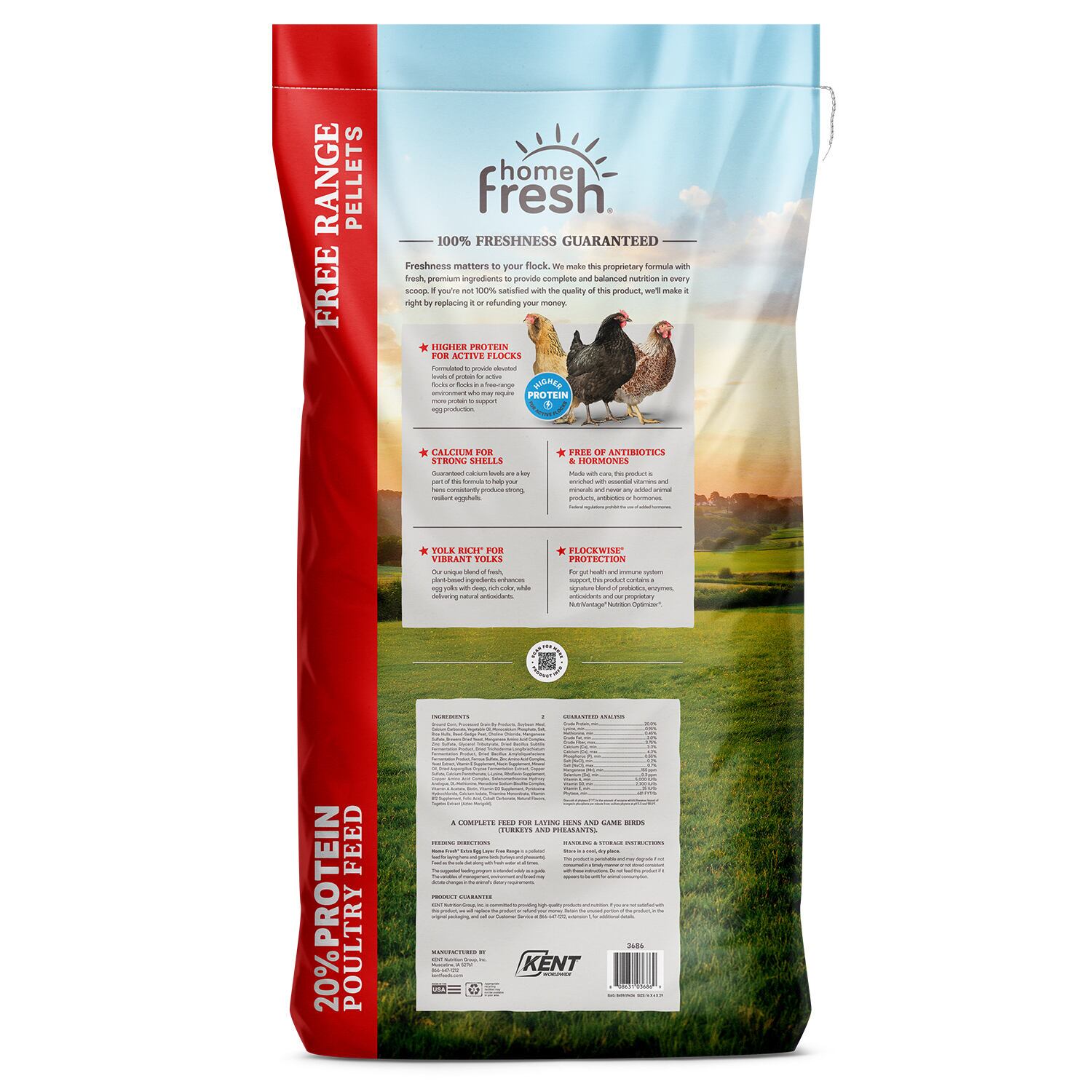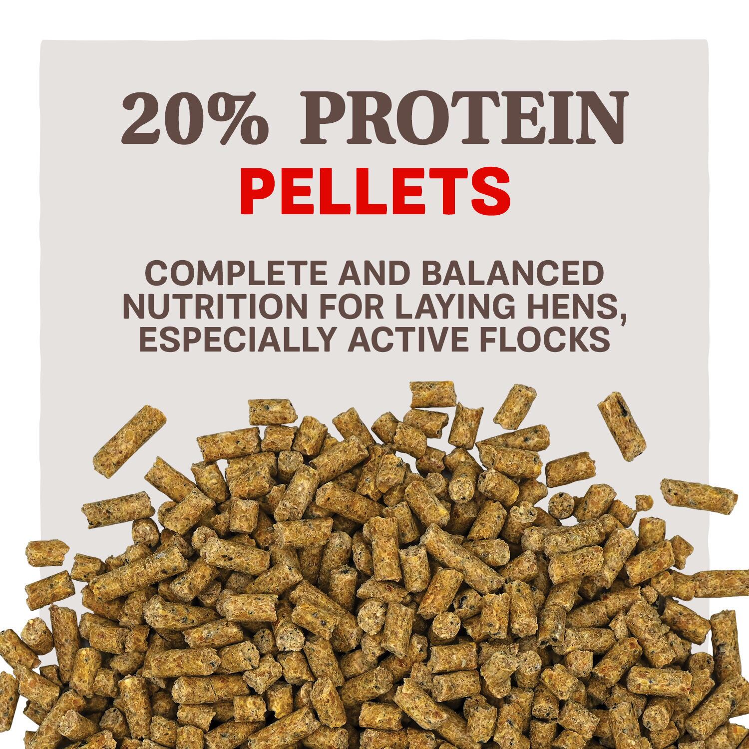 - 20% Protein for Active Flocks - Formulated to provide elevated levels of protein for active flocks or flocks in a free range environment who may require more protein to support egg production.