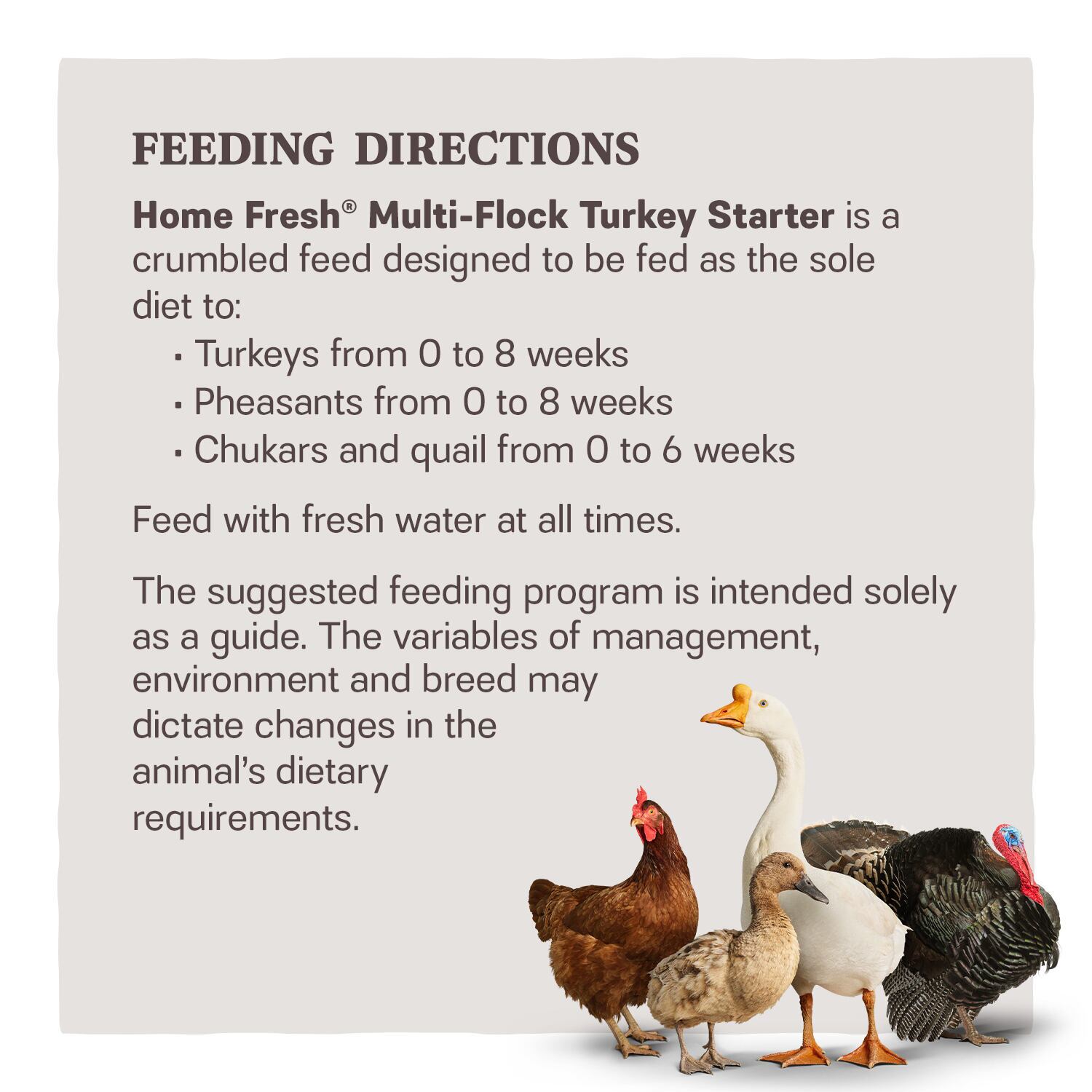 Home Fresh Multi-Flock products are designed to meet the specific life-stage nutritional needs for your entire flock, from starting, growing, breeding and overall maintenance. Home Fresh Multi-Flock Turkey Starter 28 is a complete diet for starting turkeys, pheasants, quail, and chukars