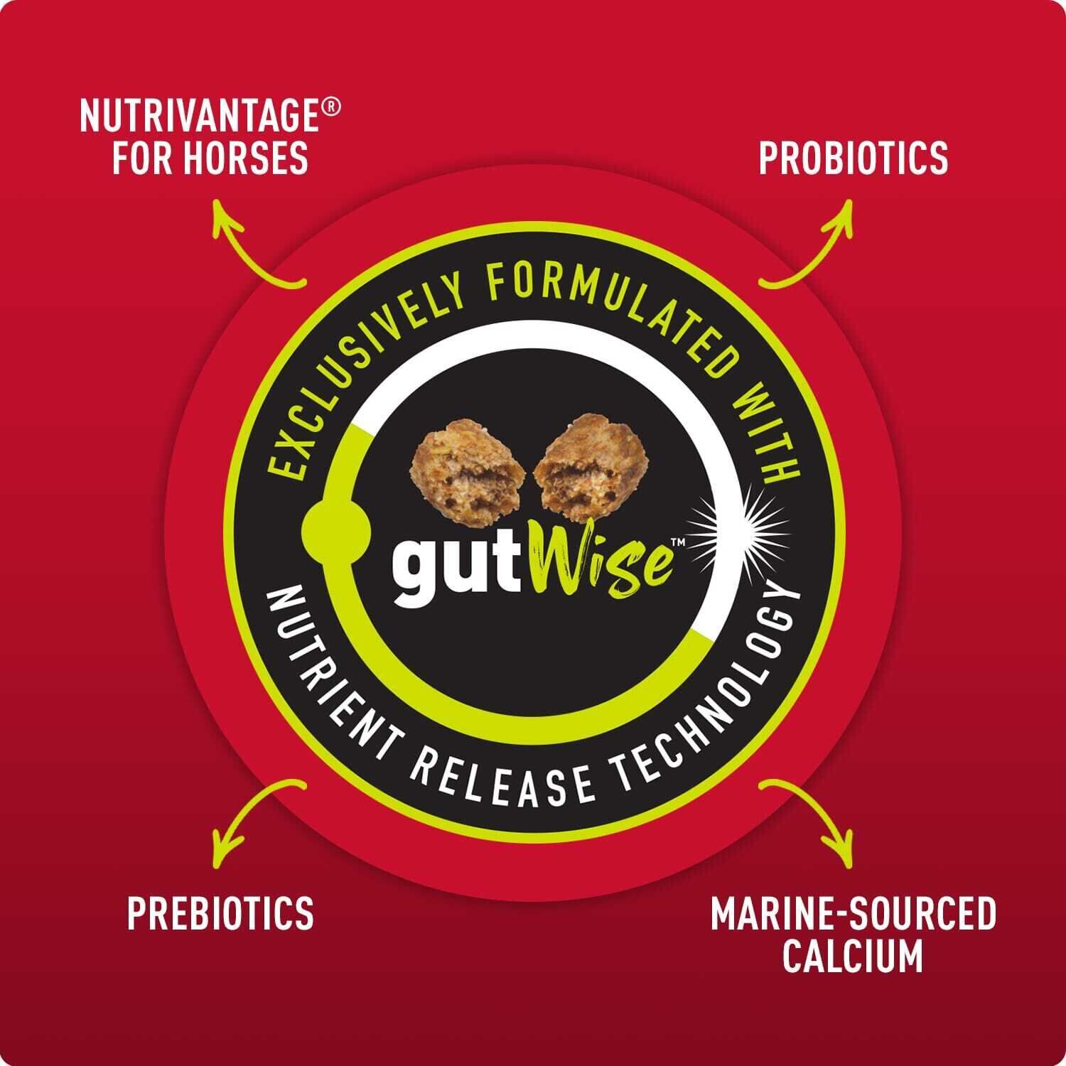 - gutWise™ Nutrient Release Technology - A proprietary blend of prebiotics, probiotics, marine-sourced calcium and NutriVantage® for horses helps maintain total digestive health. These components are delivered in an exclusive extruded form to help support nutrient digestibility and availability.