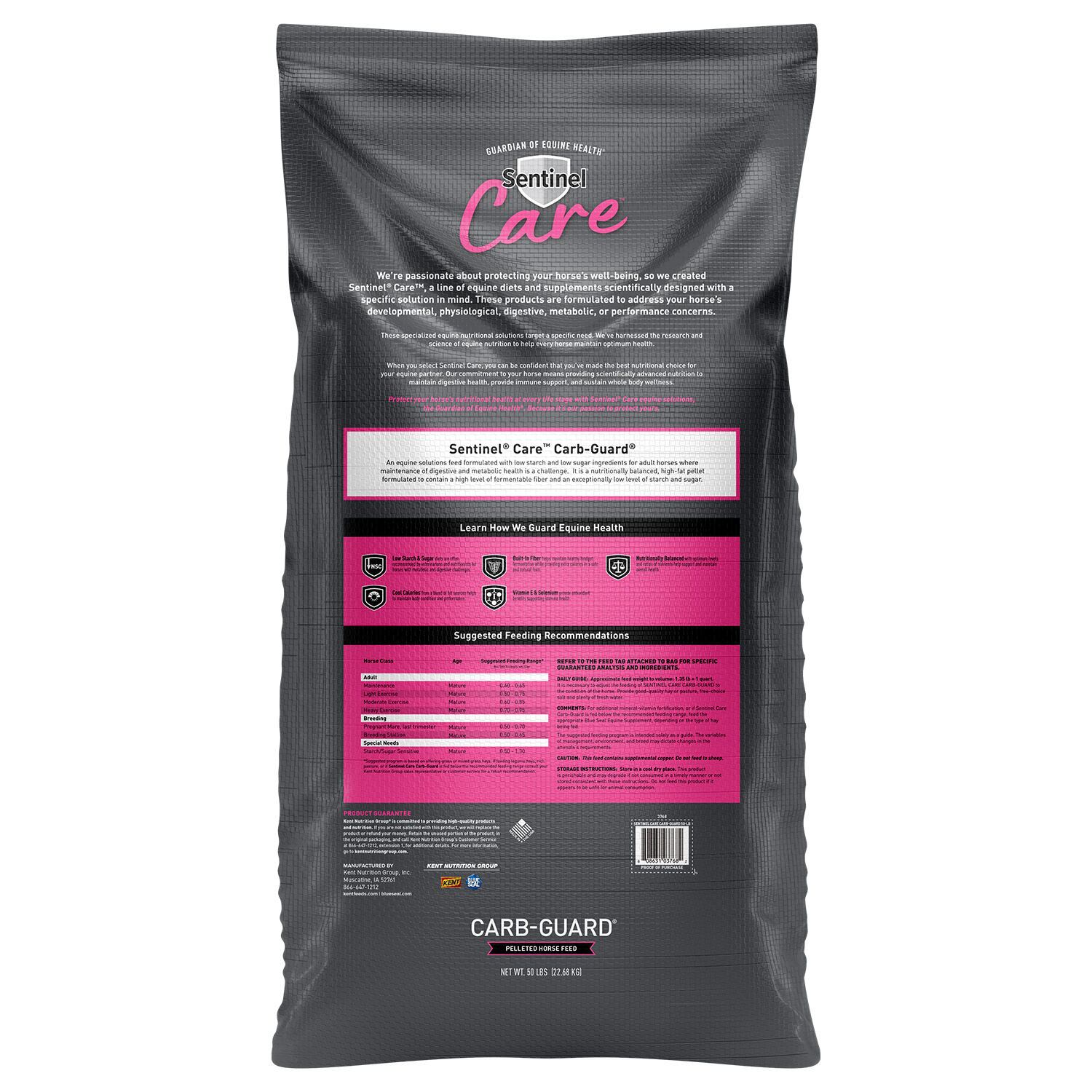 BLUE SEAL Sentinel Care CARB-GUARD is a low protein high fat, pellet formulated with low levels of starch and sugars. Sentinel Care CARB-GUARD offers a safe and natural way to feed mature horses at all levels of performance.