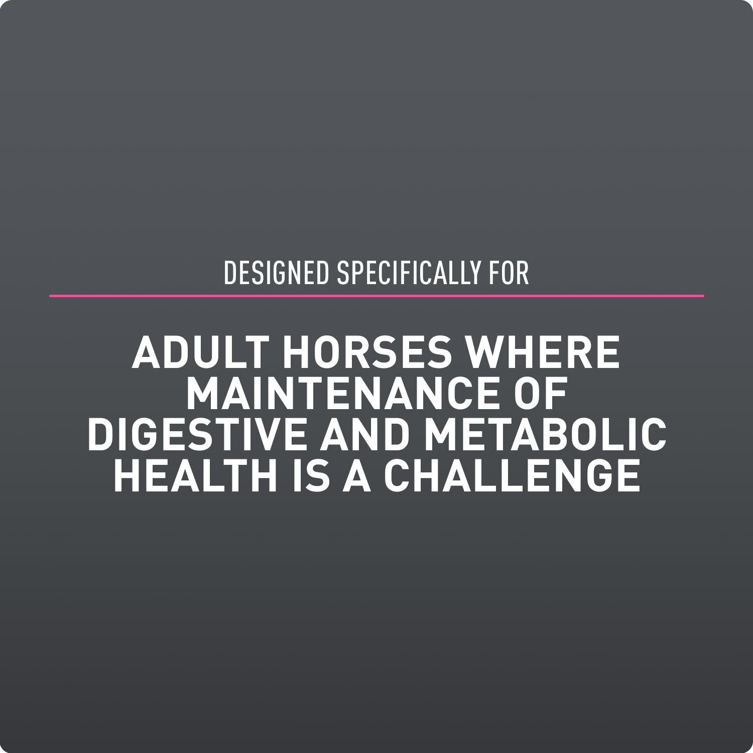 An equine solutions feed formulated with low starch and low sugar ingredients for adult horses where maintenance of digestive and metabolic health is a challenge. It is a nutritionally balanced, high-fat pellet formulated to contain a high level of fermentable fiber and an exceptionally low level of starch and sugar.