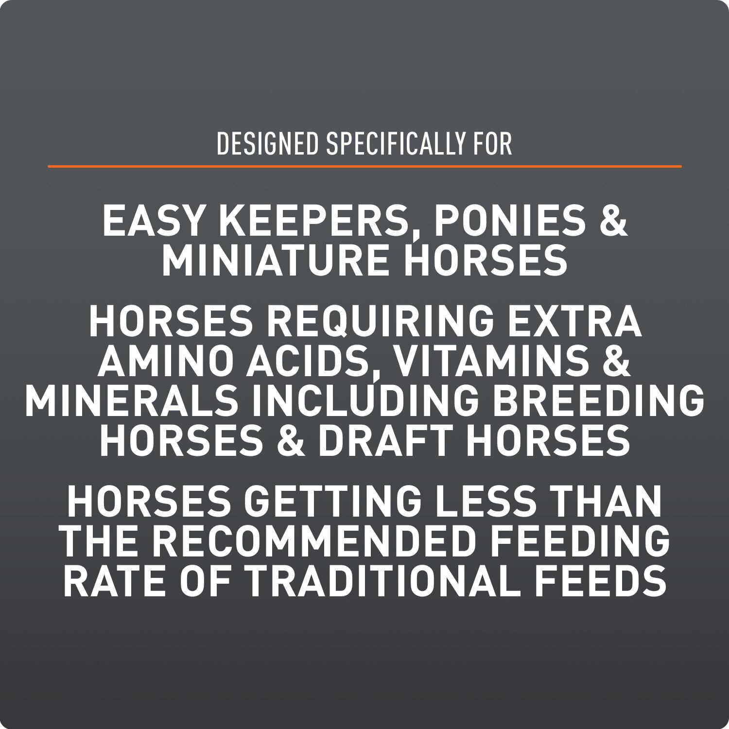 - Concentrated Nutrition - A nutrient dense diet provides concentrated nutrition allowing for a reduced feeding rate which minimizes starch and sugar intake.