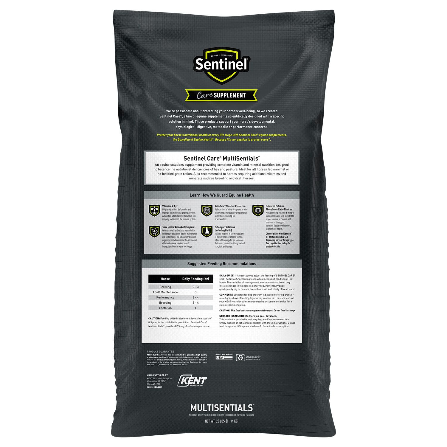 Sentinel® Care™ MultiSentials™ can be top-dressed over feed or offered free-choice. Feed at a rate of 2 to 4 oz per horse per day depending on life stage, activity and physiological status. 50 g = 2 oz.