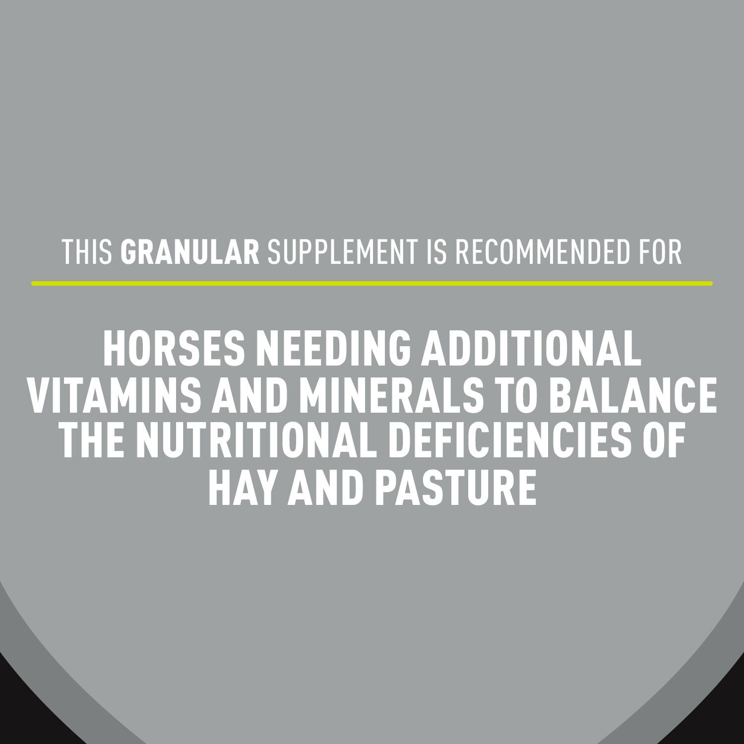 An equine solutions supplement providing complete vitamin and mineral nutrition designed to balance the nutritional deficiencies of hay and pasture. Ideal for all horses fed minimal or no fortified grain ration. Also recommended for horses requiring additional vitamins and minerals such as breeding and draft horses.