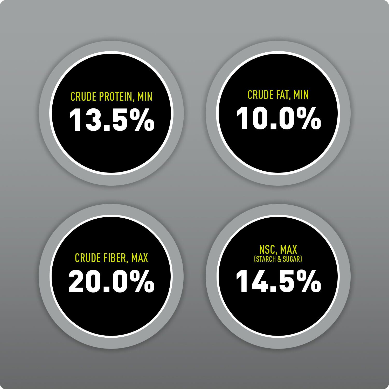 - Built-In Fiber - Fiber sources such as soybean hulls, beet pulp and alfalfa meal may help maintain healthy hind-gut fermentation while providing extra calories in a safe and natural form.