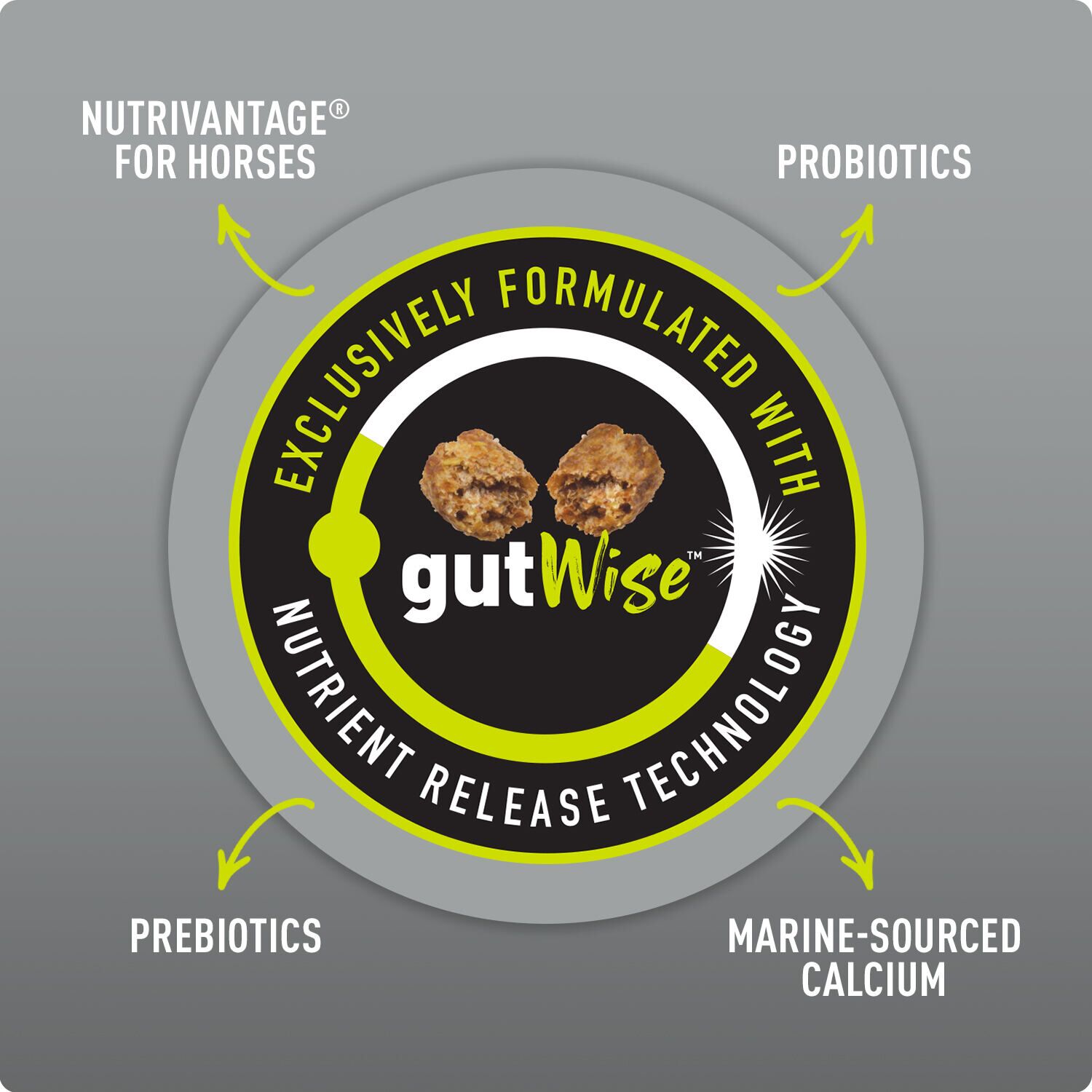 - gutWise™ Nutrient Release Technology - A proprietary blend of prebiotics, probiotics, marine-sourced calcium and NutriVantage® for horses helps maintain total digestive health. These components are delivered in an exclusive extruded form to help support nutrient digestibility and availability.