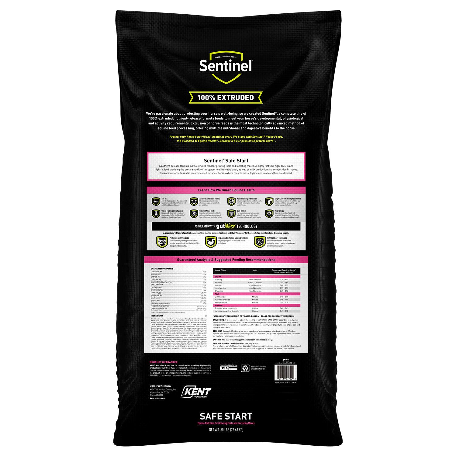 KENT SENTINEL SAFE START is a high protein, high fat, pressure cooked feed that offers a safe and natural way to provide essential nutrition to lactating mares and young growing foals. SENTINEL SAFE START can also be fed to show horses on low protein hay or when extra shine and condition is desired.