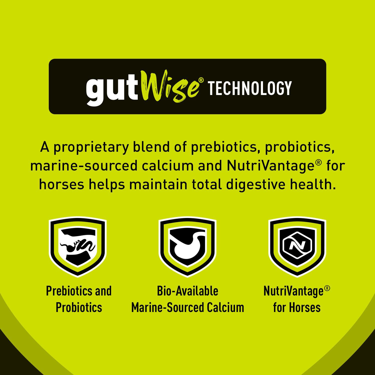 - gutWise™ Nutrient Release Technology - A proprietary blend of prebiotics, probiotics, marine-sourced calcium and NutriVantage® for horses helps maintain total digestive health. These components are delivered in an exclusive extruded form to help support nutrient digestibility and availability.
